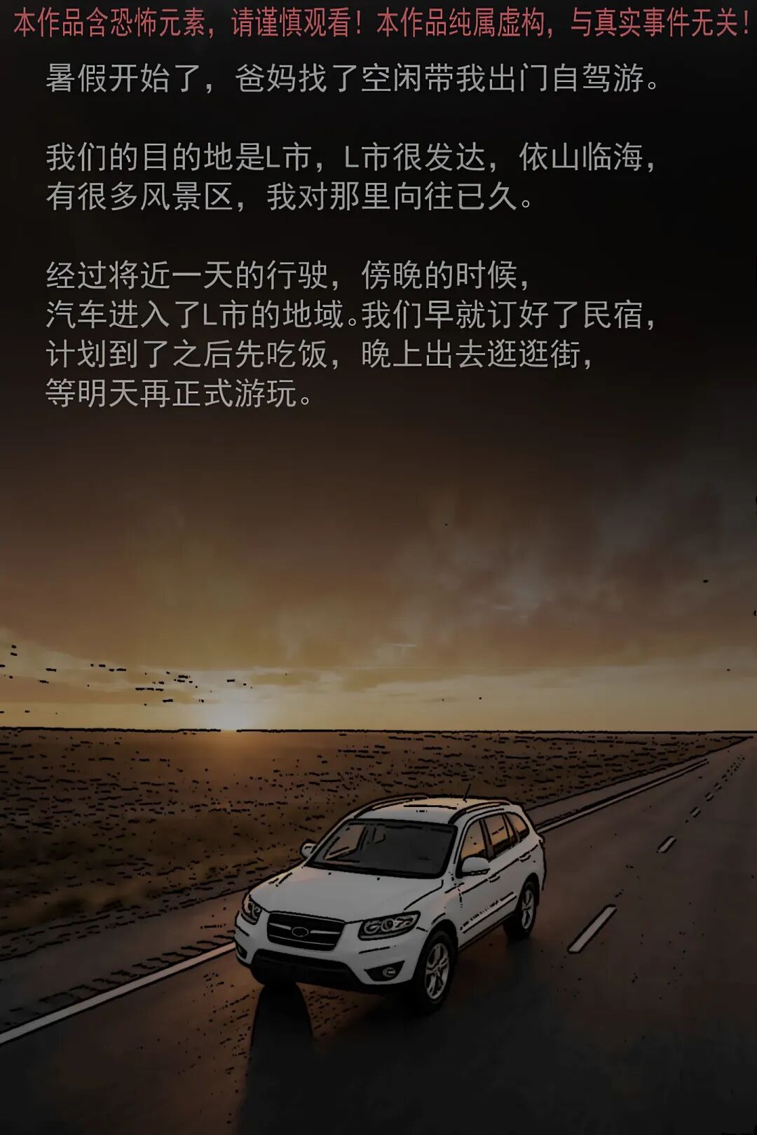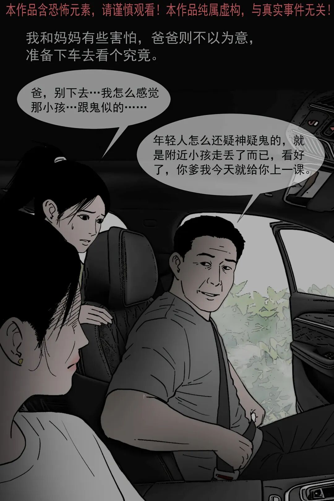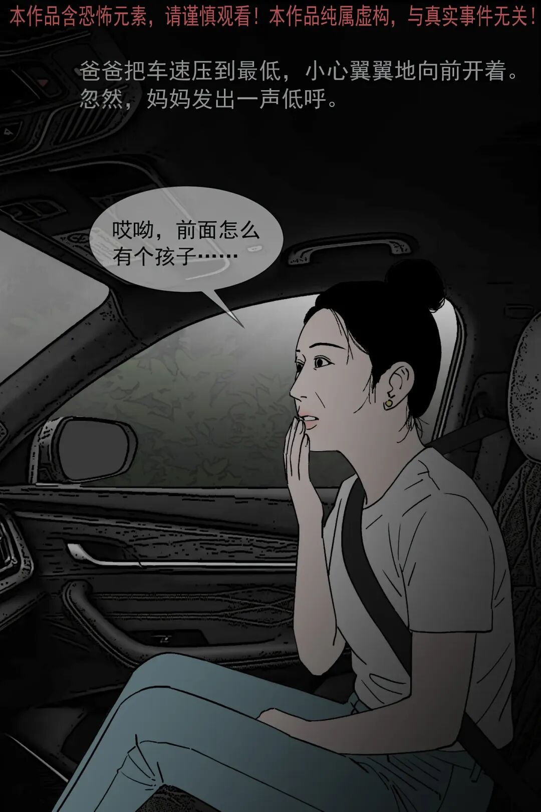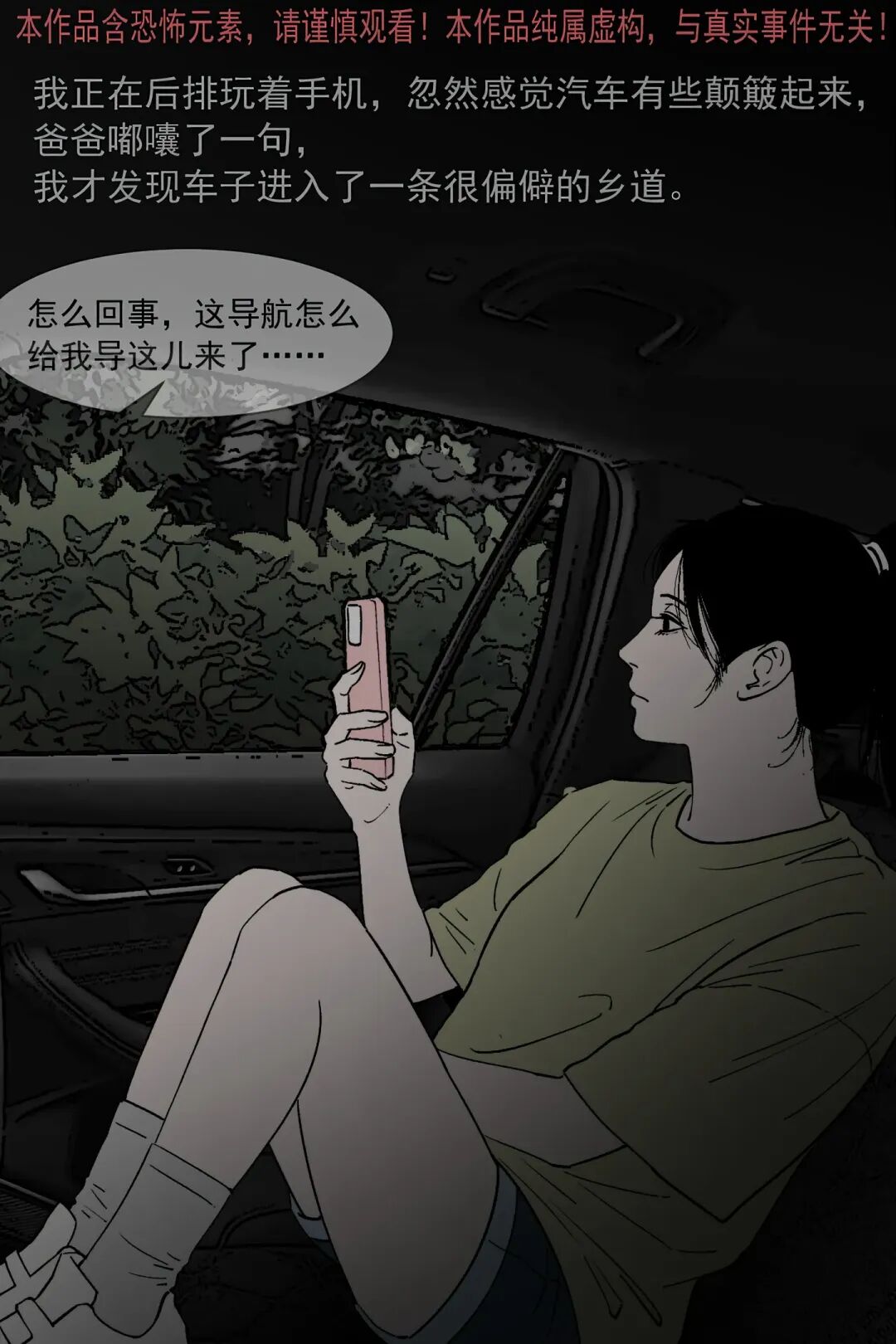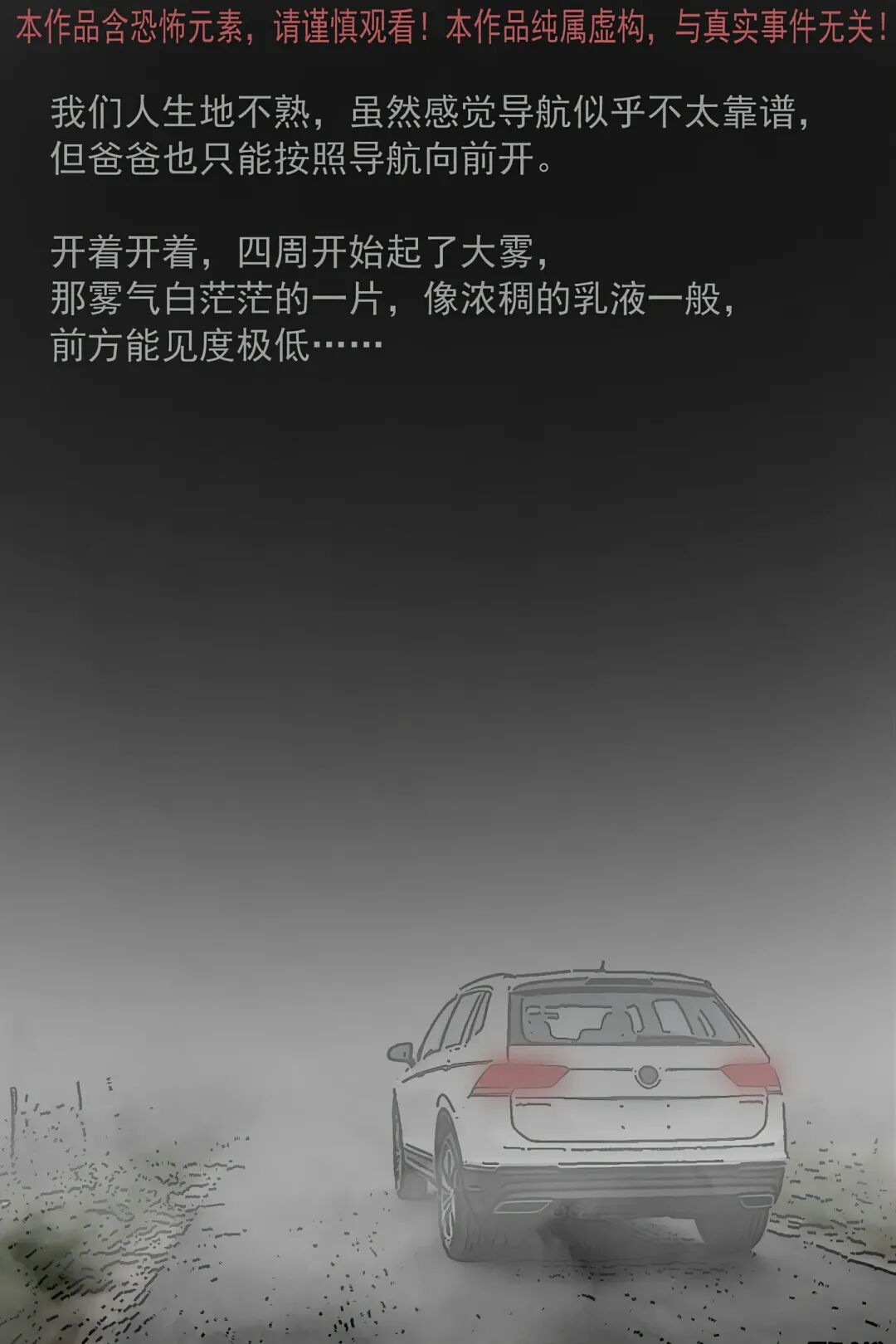 暑假里 “我” 和爸妈自驾去 L 市游玩,导航却把车导进偏僻乡道,还遇上漫天大雾,路上发现一个蹲在路中央的小孩。爸爸不顾 “我” 和妈妈的害怕下车查看,结果看到小孩后定在原地毫无反应。