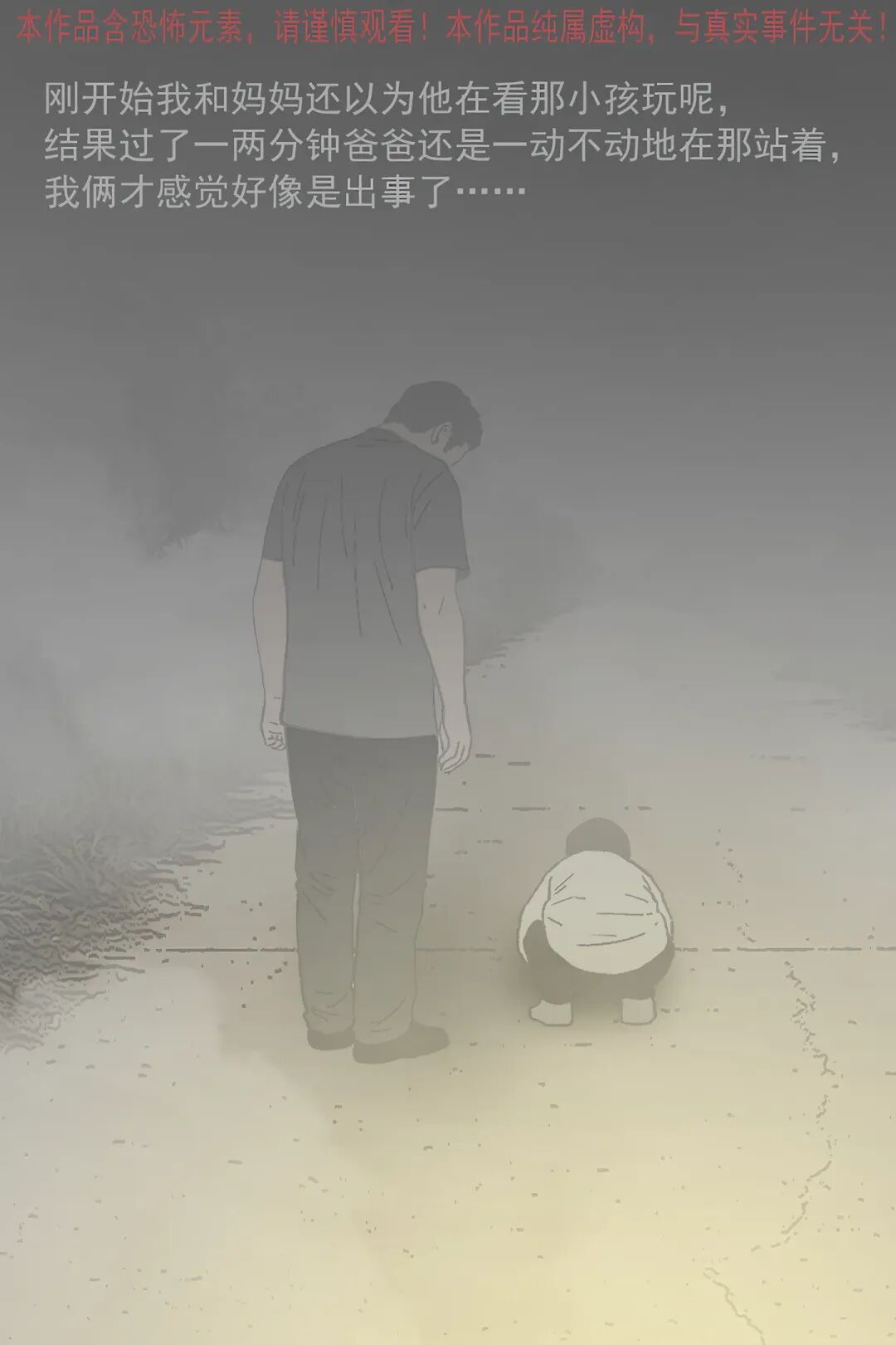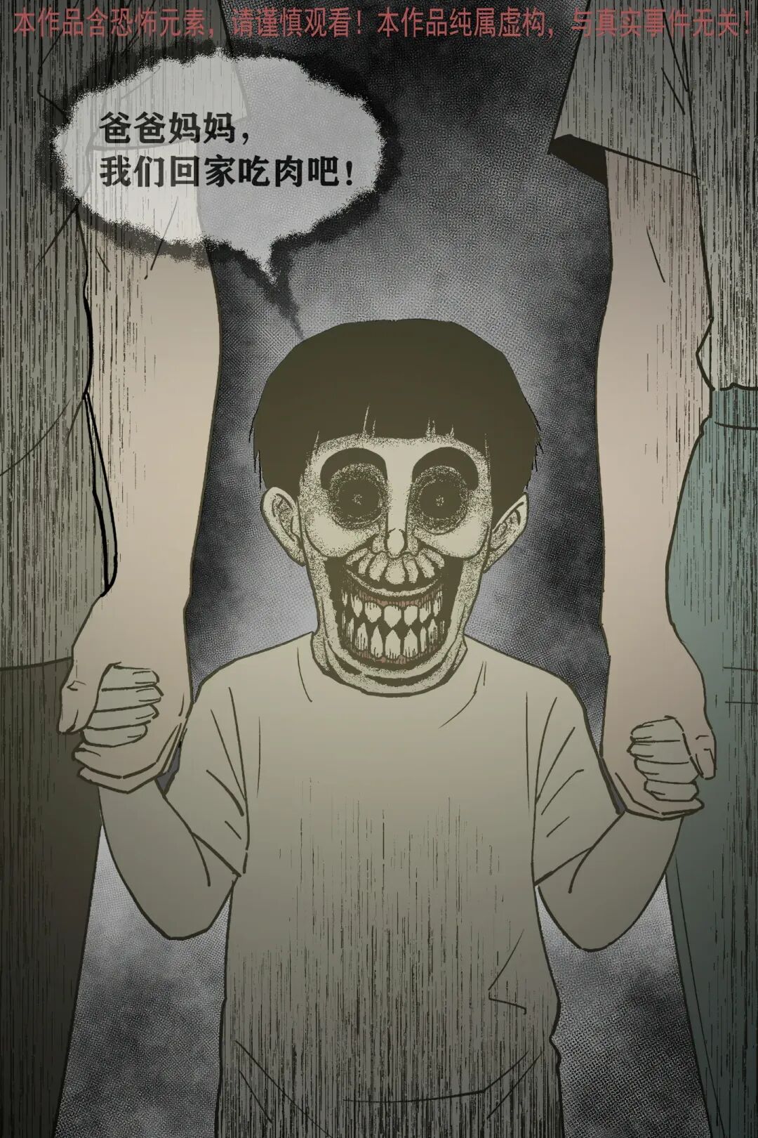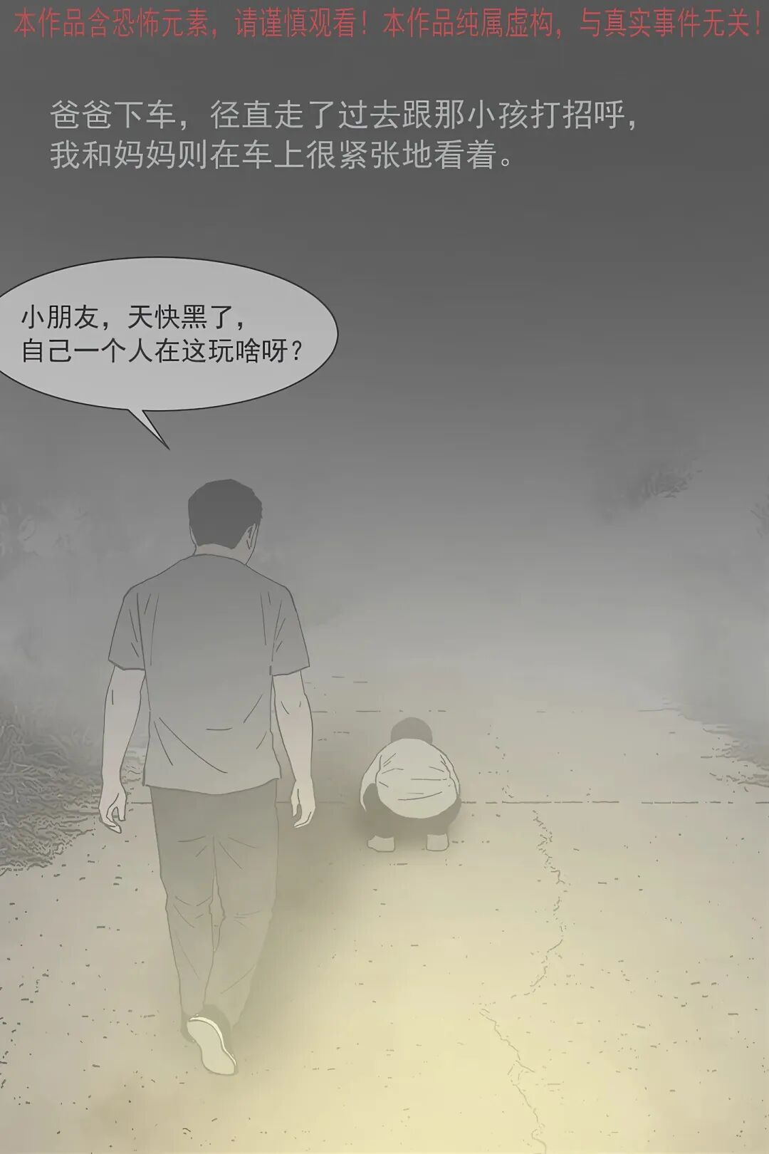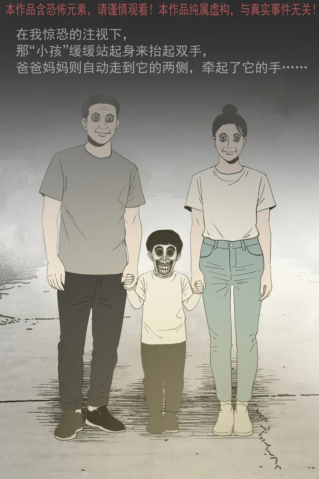 “我” 和妈妈下车呼喊爸爸,靠近后小孩突然转头,“我” 发现它根本不是人类,妈妈却露出诡异笑容。随后这个怪异 “小孩” 起身,爸妈竟主动牵起它的手,跟着它要往迷雾深处走,还说着 “回家吃肉” 的诡异话语。