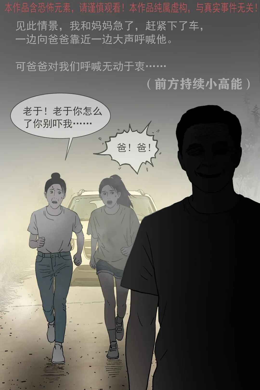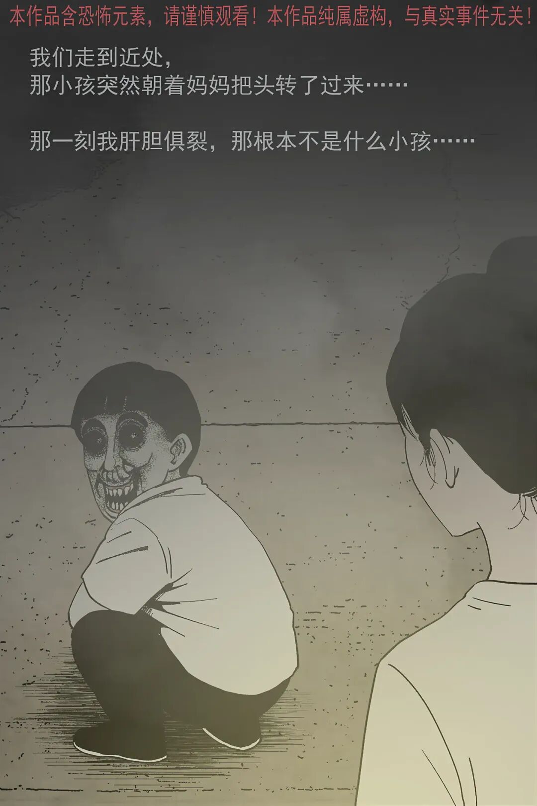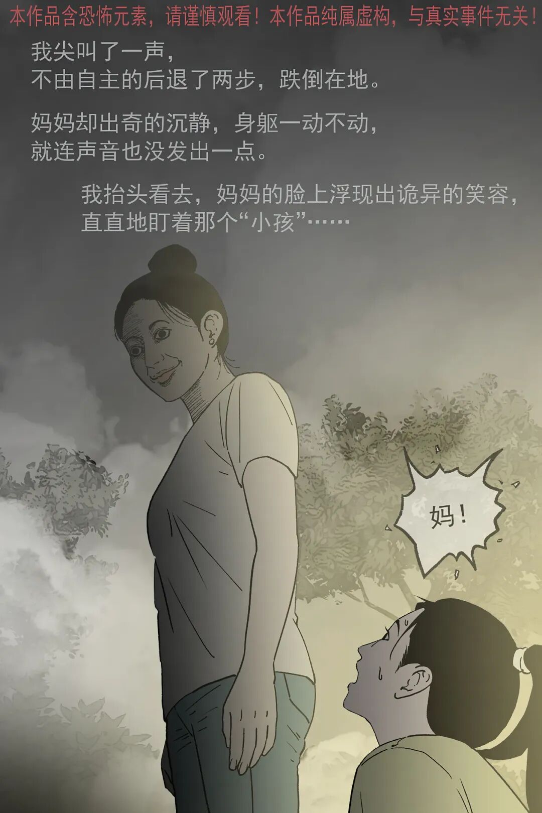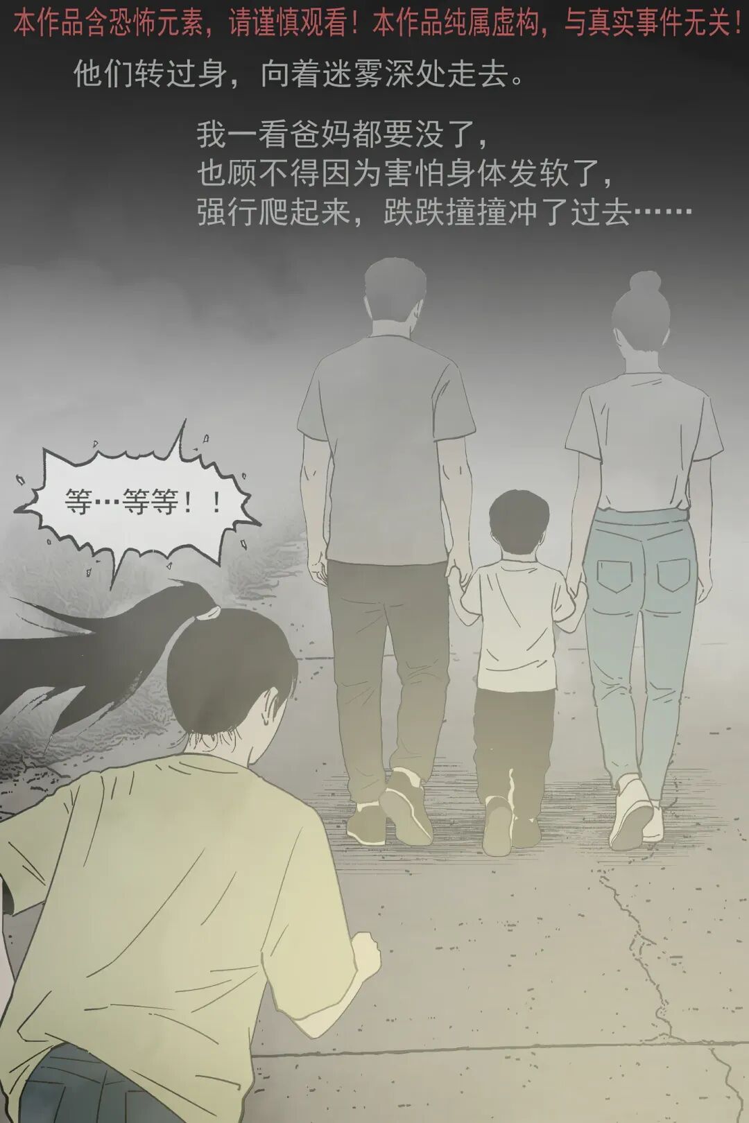 “我” 和妈妈下车呼喊爸爸,靠近后小孩突然转头,“我” 发现它根本不是人类,妈妈却露出诡异笑容。随后这个怪异 “小孩” 起身,爸妈竟主动牵起它的手,跟着它要往迷雾深处走,还说着 “回家吃肉” 的诡异话语。