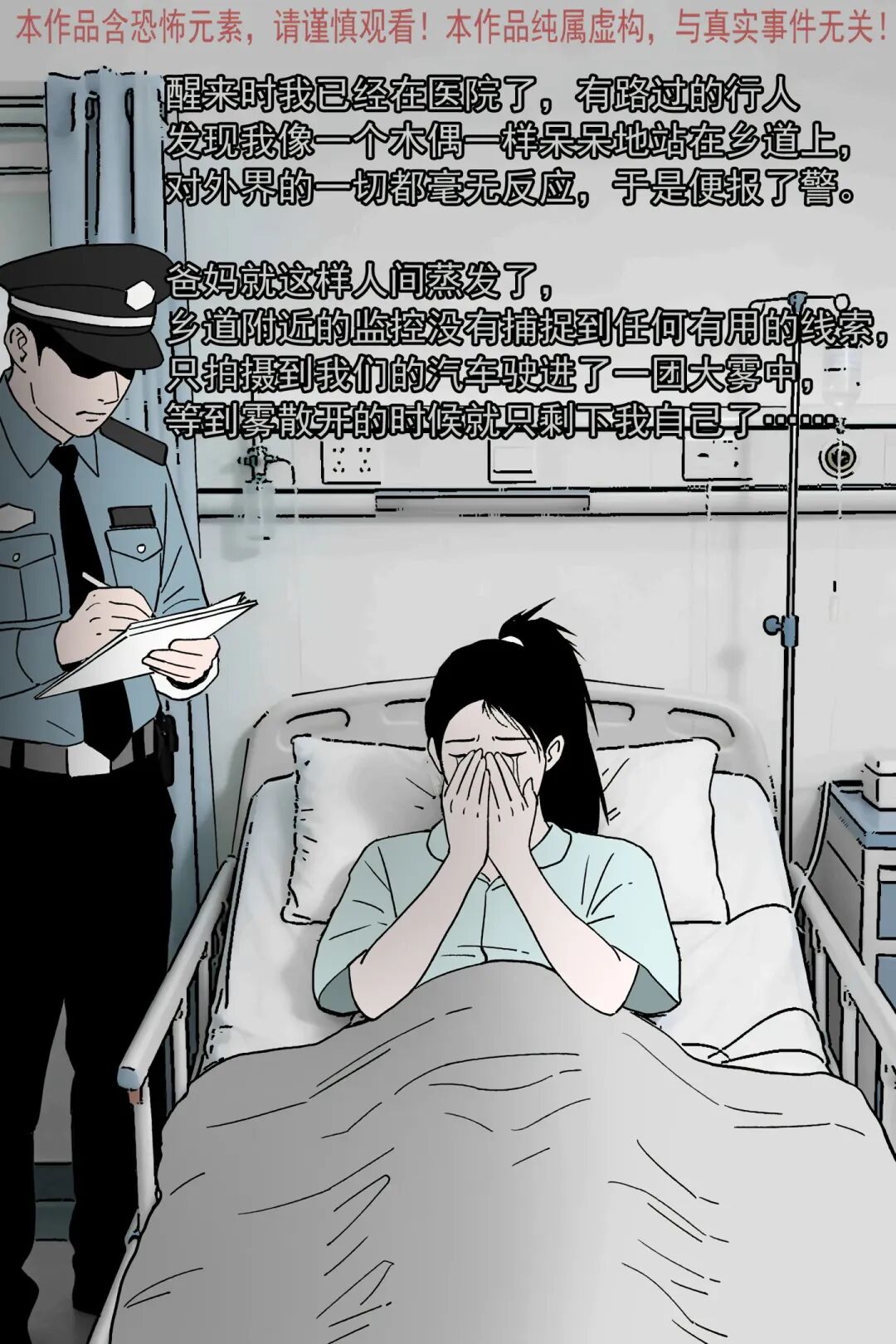 “我” 冲上去阻拦,怪异 “小孩” 脑袋一百八十度转过来瞪着 “我”,“我” 瞬间失去意识。等 “我” 在医院醒来,得知被路人发现呆立在乡道上,爸妈已然人间蒸发,监控只拍到车子驶入大雾,雾散后就只剩 “我” 一人,没有任何有用线索。