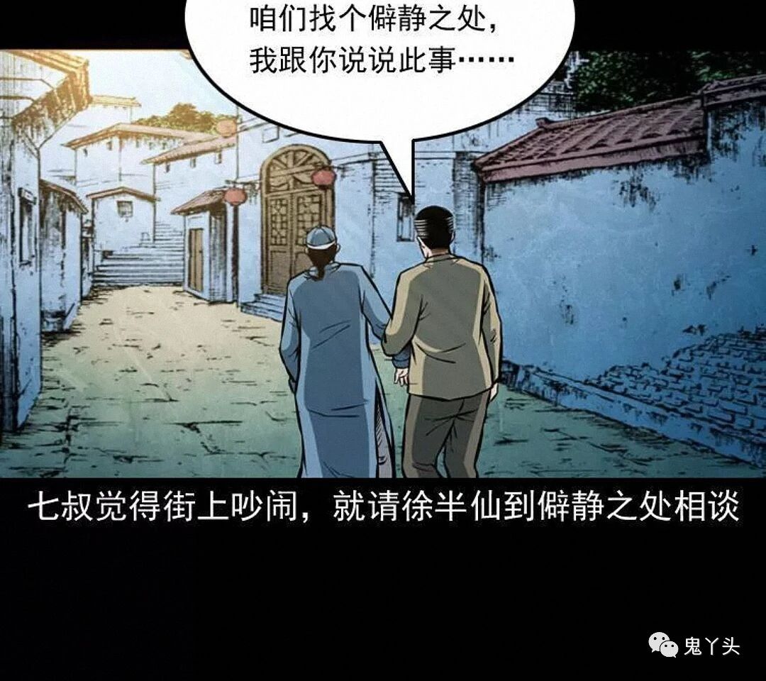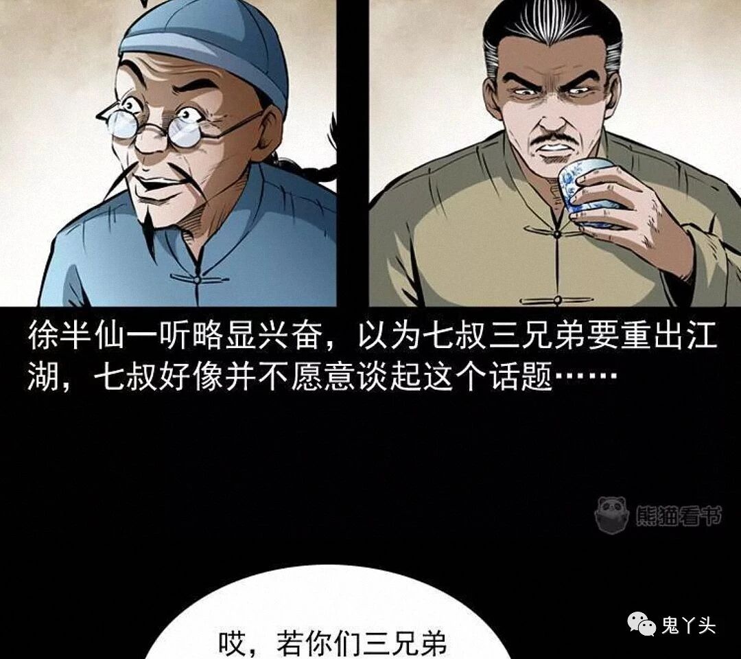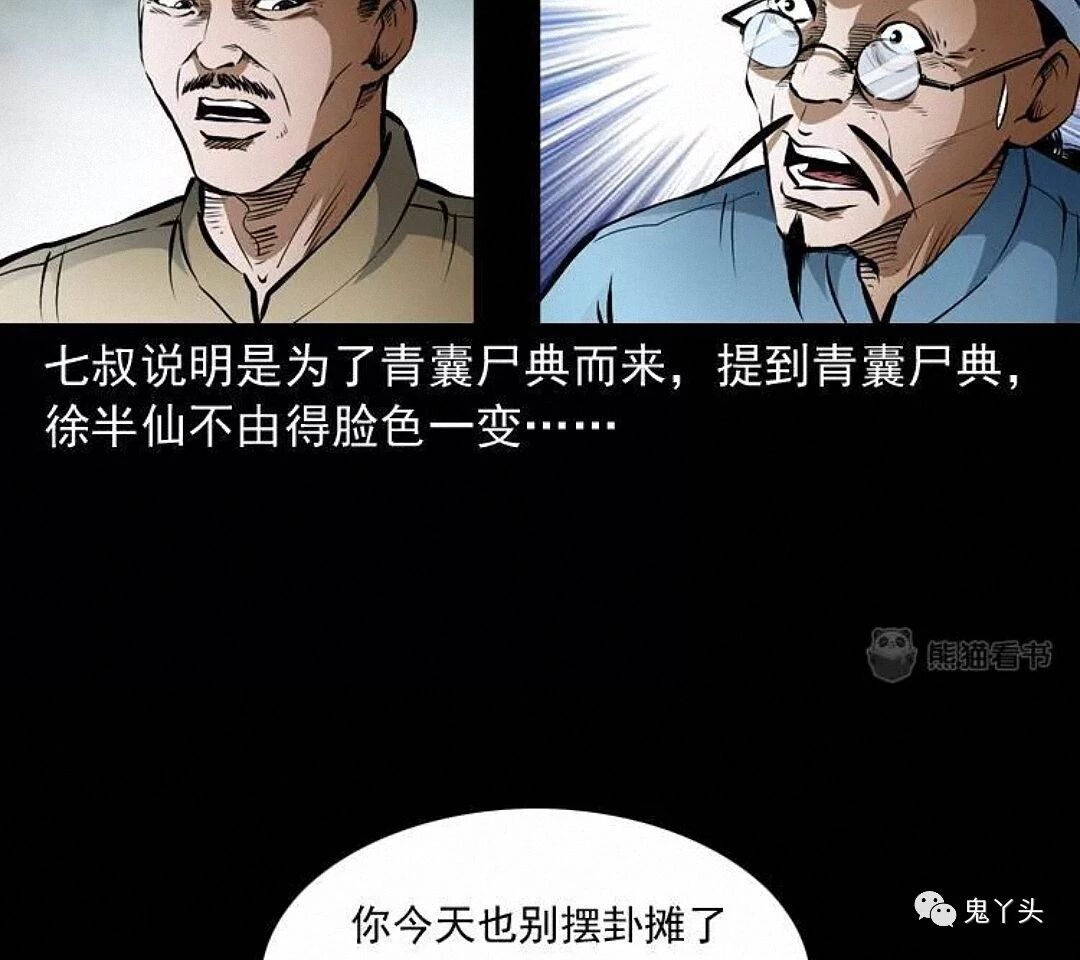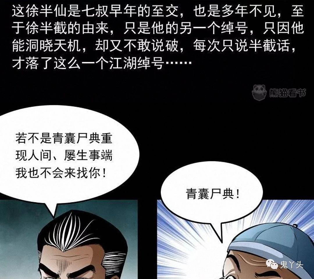 七叔好像怕徐半仙说漏了什么,把他拉到了一边,徐半仙一番莫名其妙的话,听得小江和马四海摸不着头脑,又听七叔叫徐半仙为徐半截,觉得这名字挺有趣,兄弟二人便猜测了起来,这徐半仙是七叔早年的至交,也是多年不见,至于徐半截的由来,只是他的另一个绰号,只因他能洞晓天机,却又不敢说破,每次只说半截话才落了这么一个江湖绰号,七叔说明是为了青囊尸典而来,提到青囊尸典徐半仙不由得脸色一变,七叔觉得街上吵闹,就请徐半仙到僻静之处相谈……