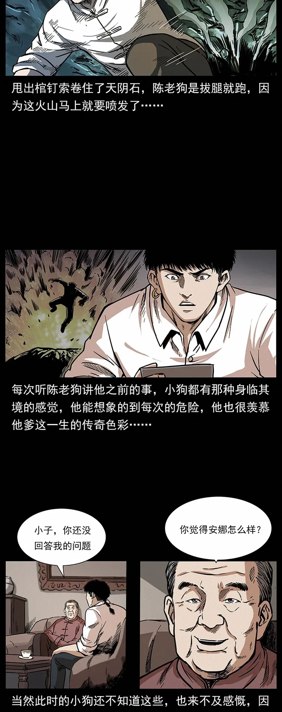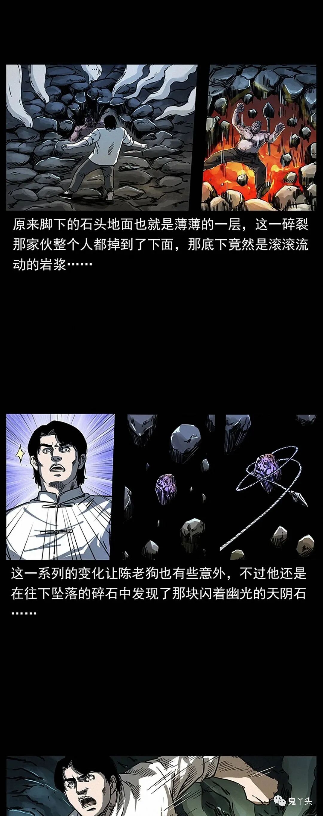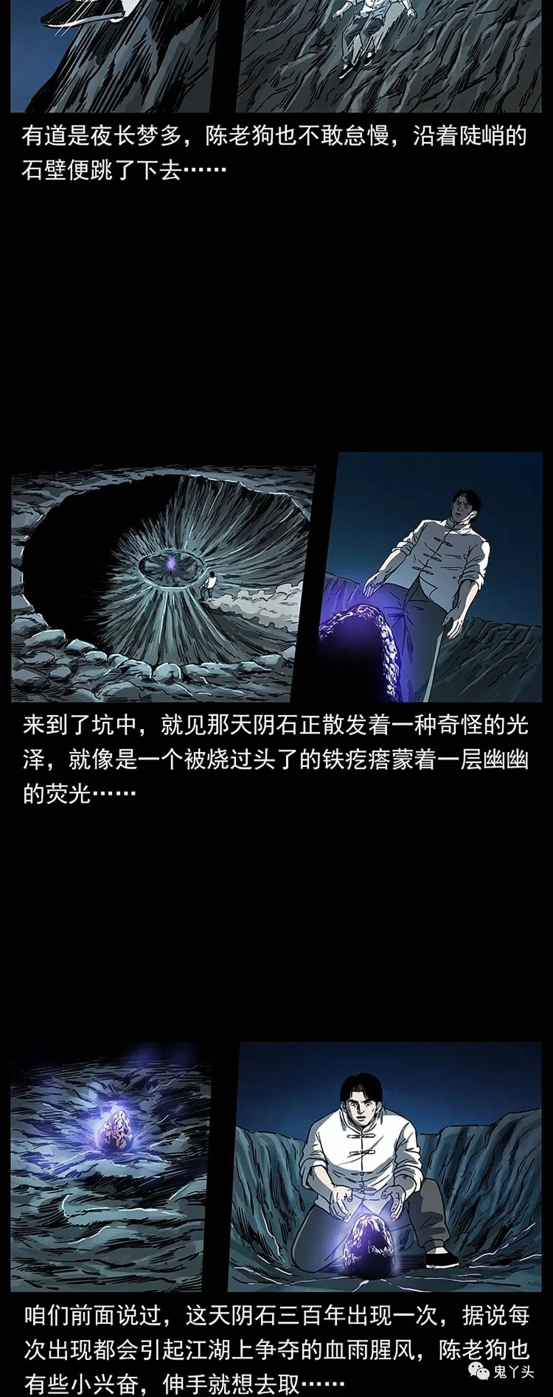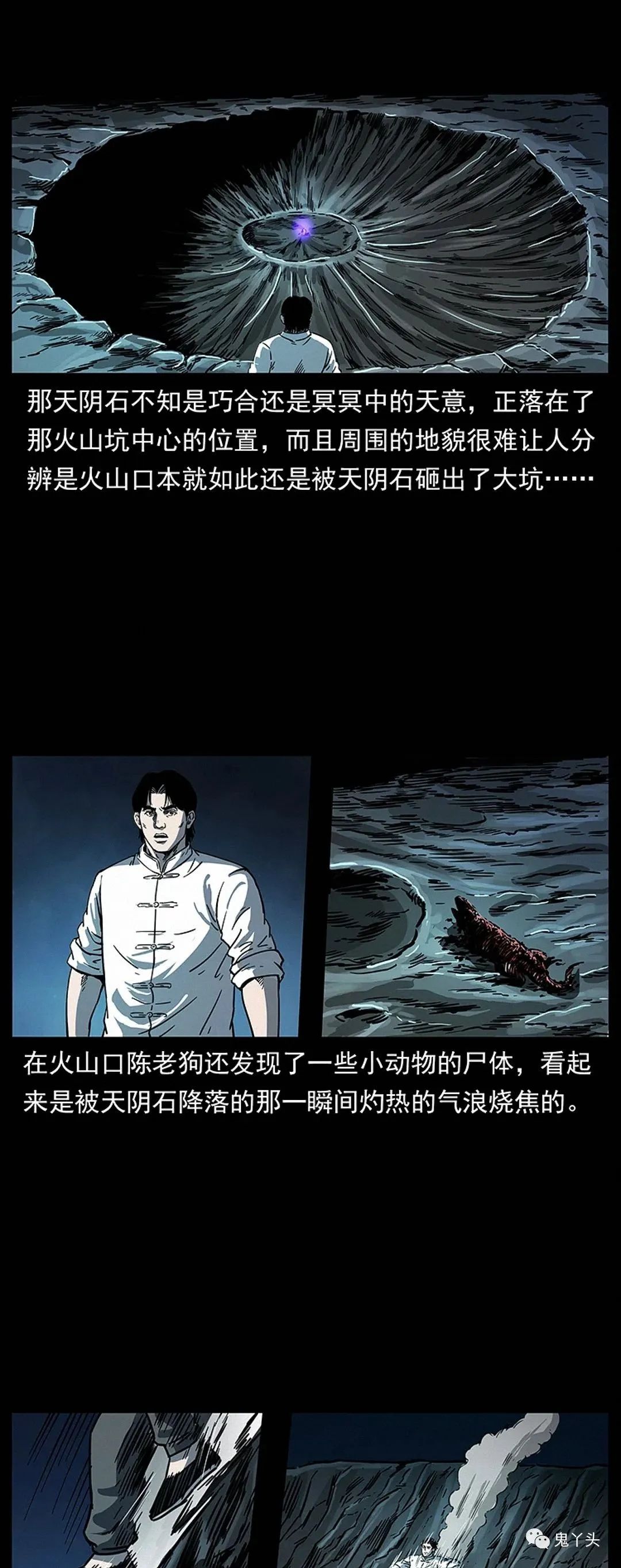 佟老掌柜并不知道陈老狗当年在山上取天阴石遇到了什么,后来陈小狗从他爹那里了解了事情的经过,话说当年陈老狗上了山顶,往下一看,果然跟自己猜测的结果差不多,那天阴石不知是巧合还是冥冥中的天意,正落在了那火山坑中心的位置,而且周围的地貌很难让人分辨是火山口本就如此还是被天阴石砸出了大坑,在火山口陈老狗还发现了一些小动物的尸体,看起来是被天阴石降落的那一瞬间灼热的气浪烧焦的。有道是夜长梦多,陈老狗也不敢怠慢,沿着陡峭的石壁便跳了下去,来到了坑中,就见那天阴石正散发着一种奇怪的光泽,就像是一个被烧过头了的铁疙瘩蒙着一层幽幽的荧光……