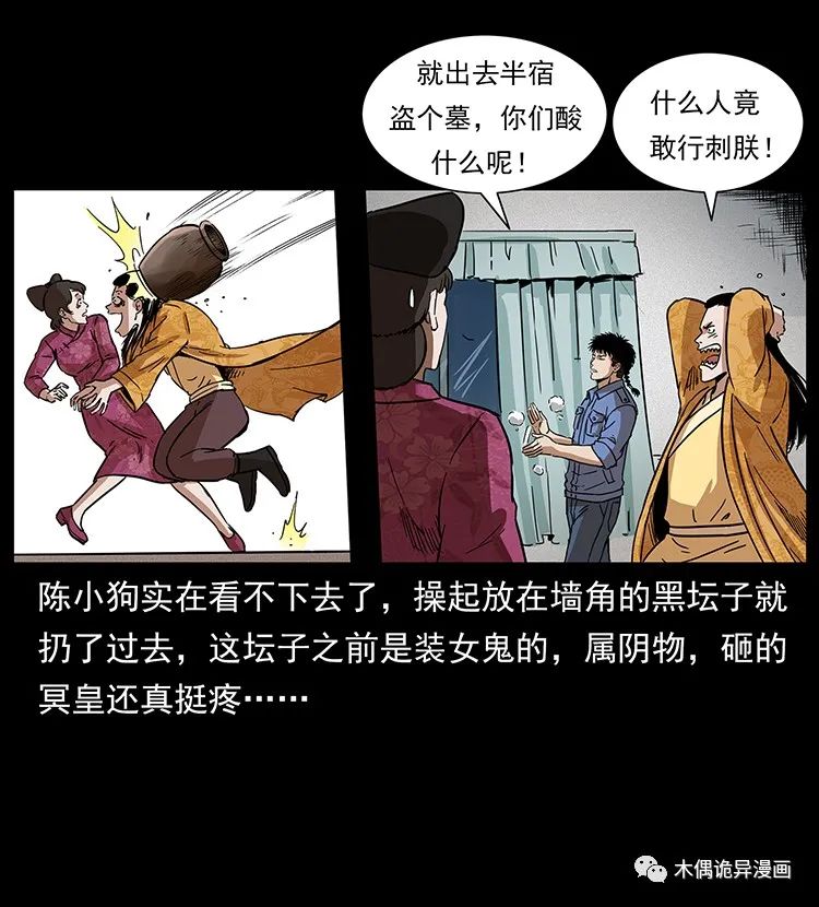 天也就是刚黑下来,冥皇就在客厅门口与一个妃子上演了生死离别的感情大戏,陈小狗实在看不下去了,操起放在墙角的黑坛子就扔了过去,这坛子之前是装女鬼的,属阴物,砸的冥皇还真挺疼,两个人商量好,今晚要去冥皇感应到的那个衣冠冢看一下,要是条件允许,就顺手给盗了,两个人刚出门,就看见一辆车急速的朝着两人冲了过来,本想给人家让个道,可没想到那车竟然来了个大漂移,硬生生的停在了陈小狗的跟前,吓得陈小狗差点没坐地上,还没等陈小狗反应过来,秦大麻烦一把就把他拽上了车……幽冥诡匠第300话之《刘瞎子斗法》